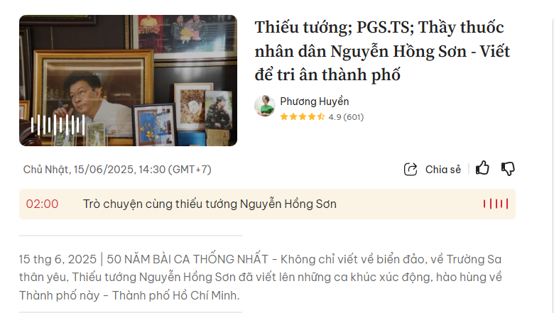 Trò chuyện cùng thiếu tướng Nguyễn Hồng Sơn Link gốc từ VOV radio: click nơi đây Link nghe VAVA HCM: click nơi đây Thiếu tướng; PGS.TS; Thầy thuốc nhân dân Nguyễn Hồng Sơn – Viết để tri ân thành phố