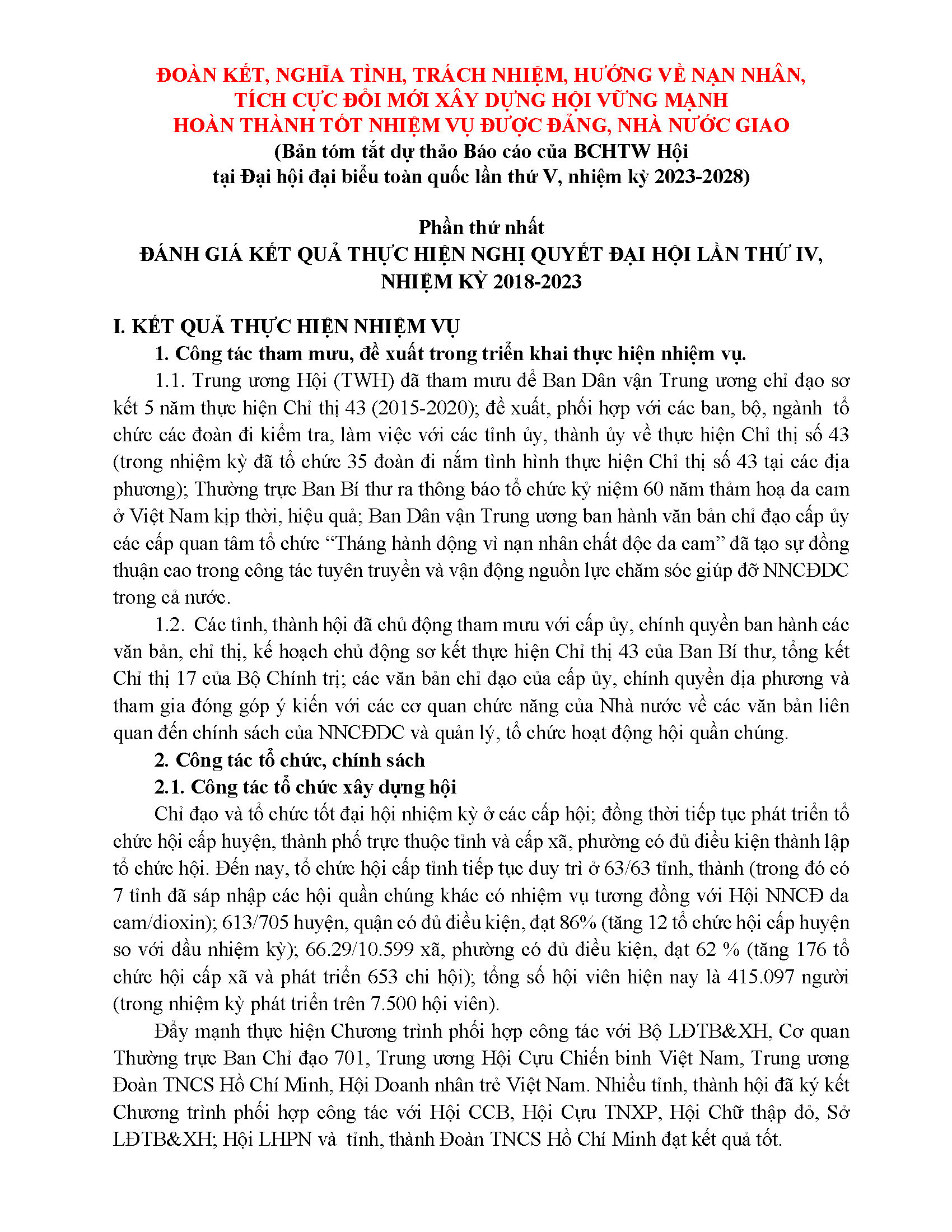 Bản tóm tắt dự thảo Báo cáo của BCHTW Hội tại Đại hội đại biểu toàn quốc lần thứ V, nhiệm kỳ 2023-2028