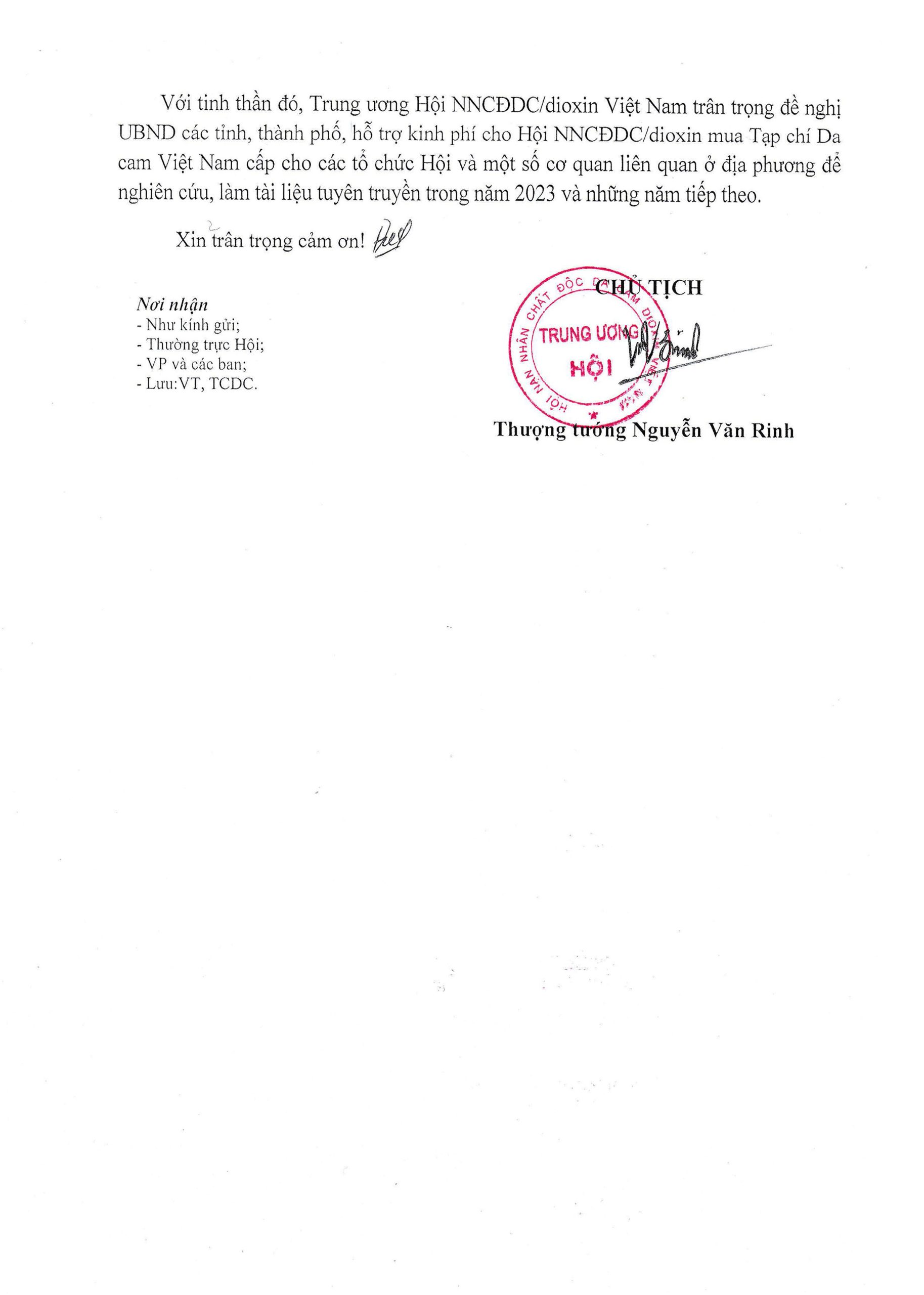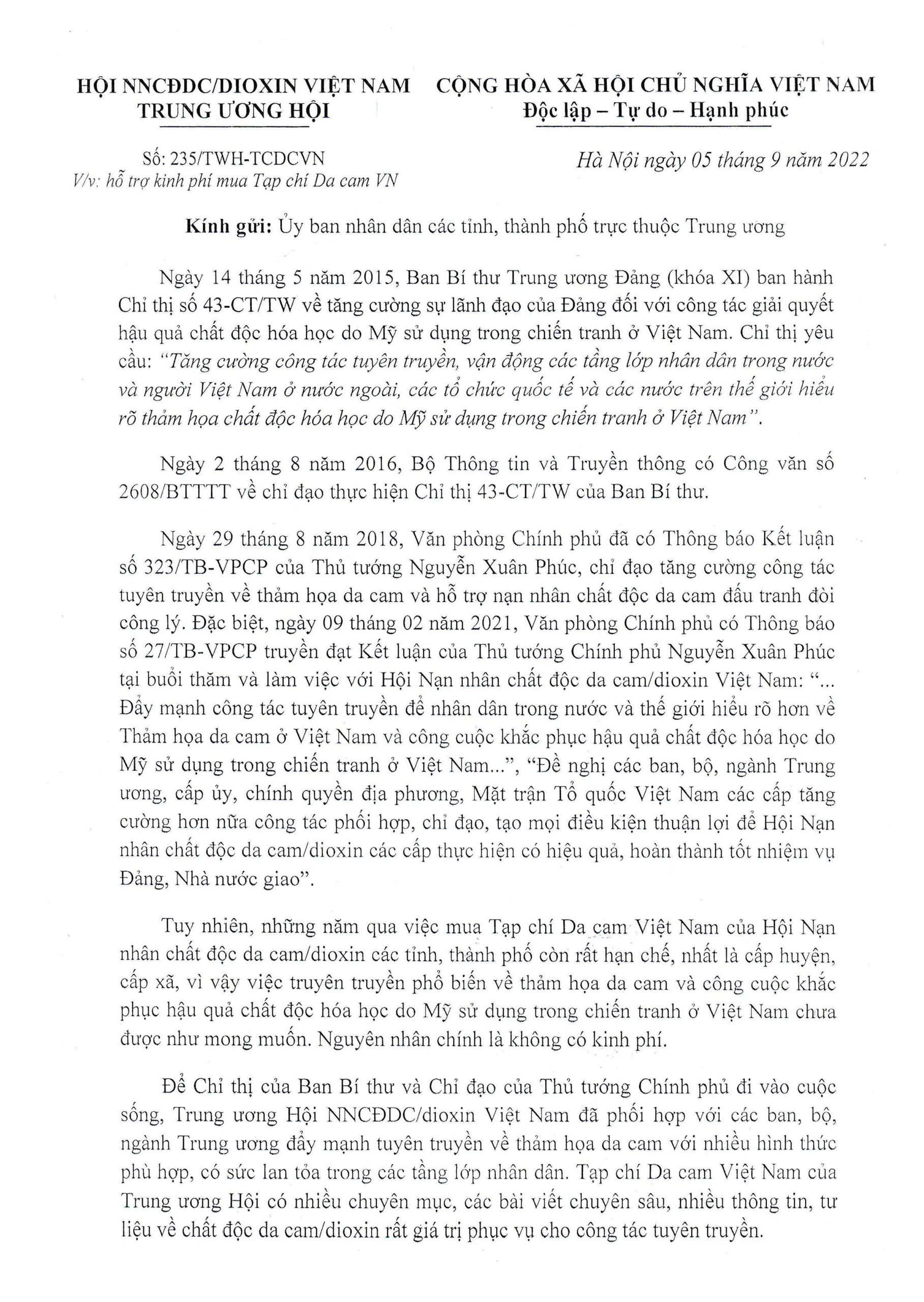 Công văn 235/TWH-TCDCVN gửi Ủy ban nhân dân các tỉnh, thành phố trực thuộc Trung ương về việc hỗ trợ kinh phí mua Tạp chí Da cam Việt Nam