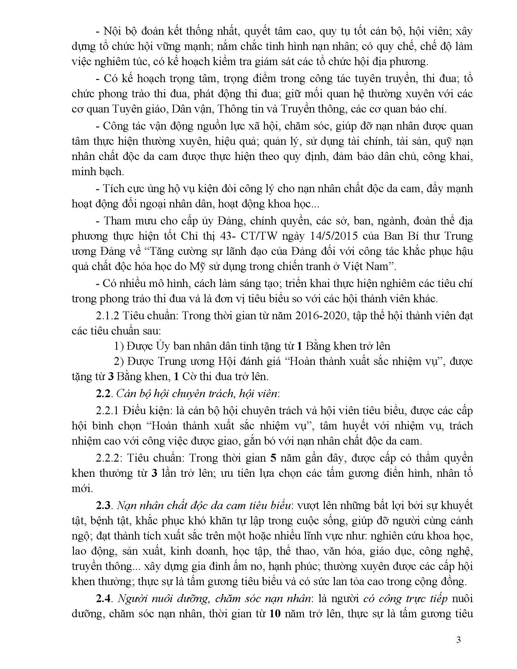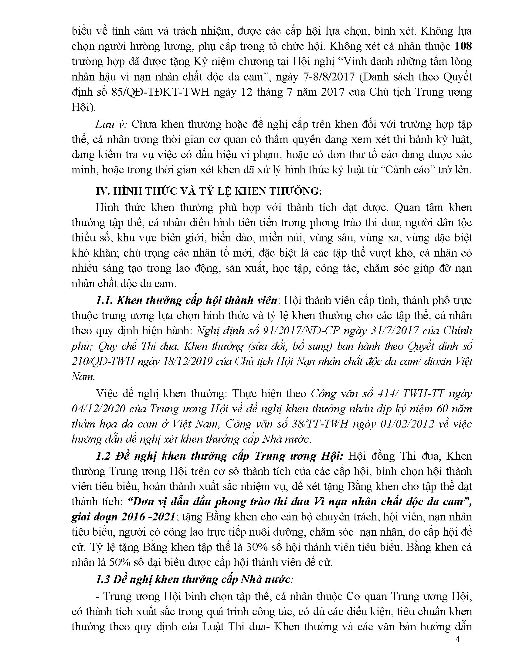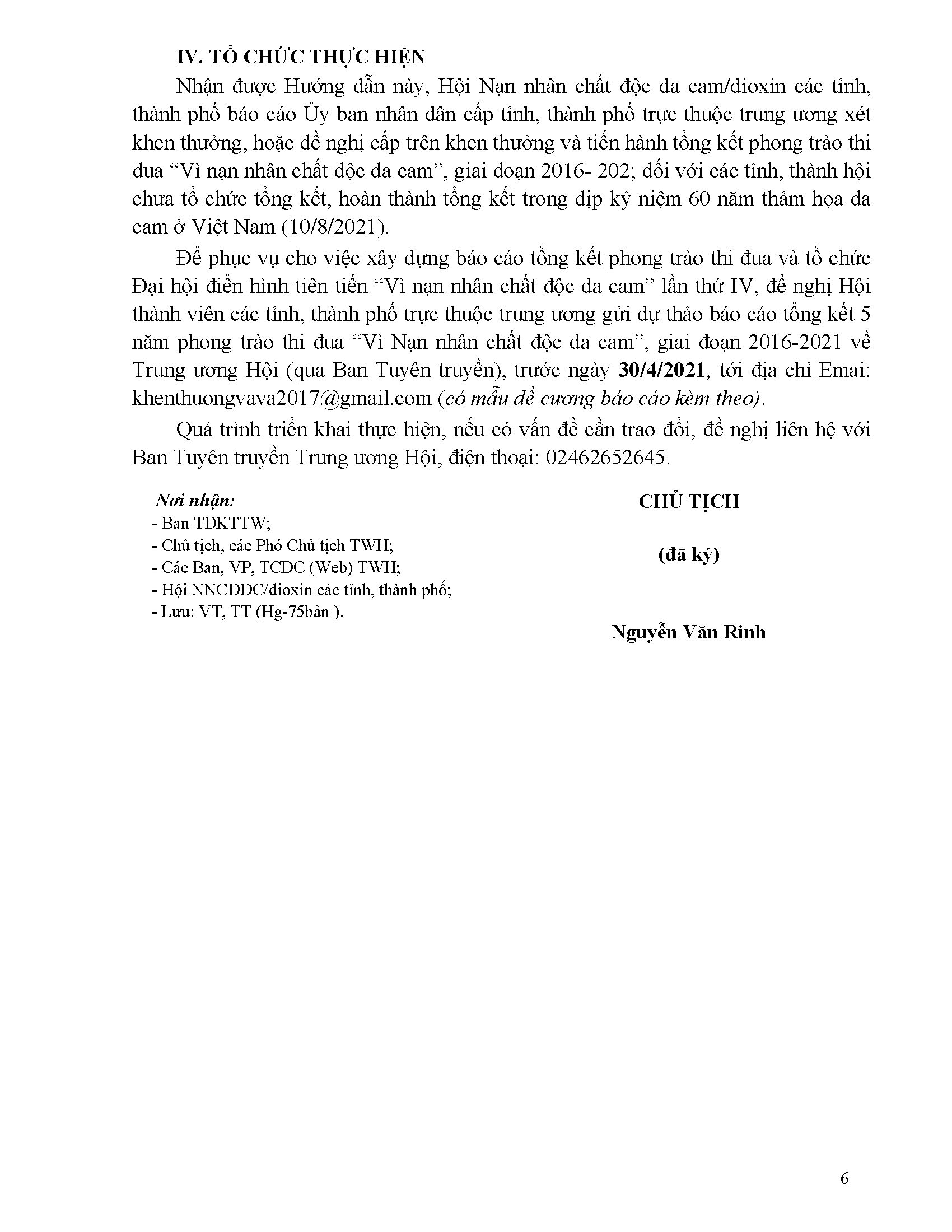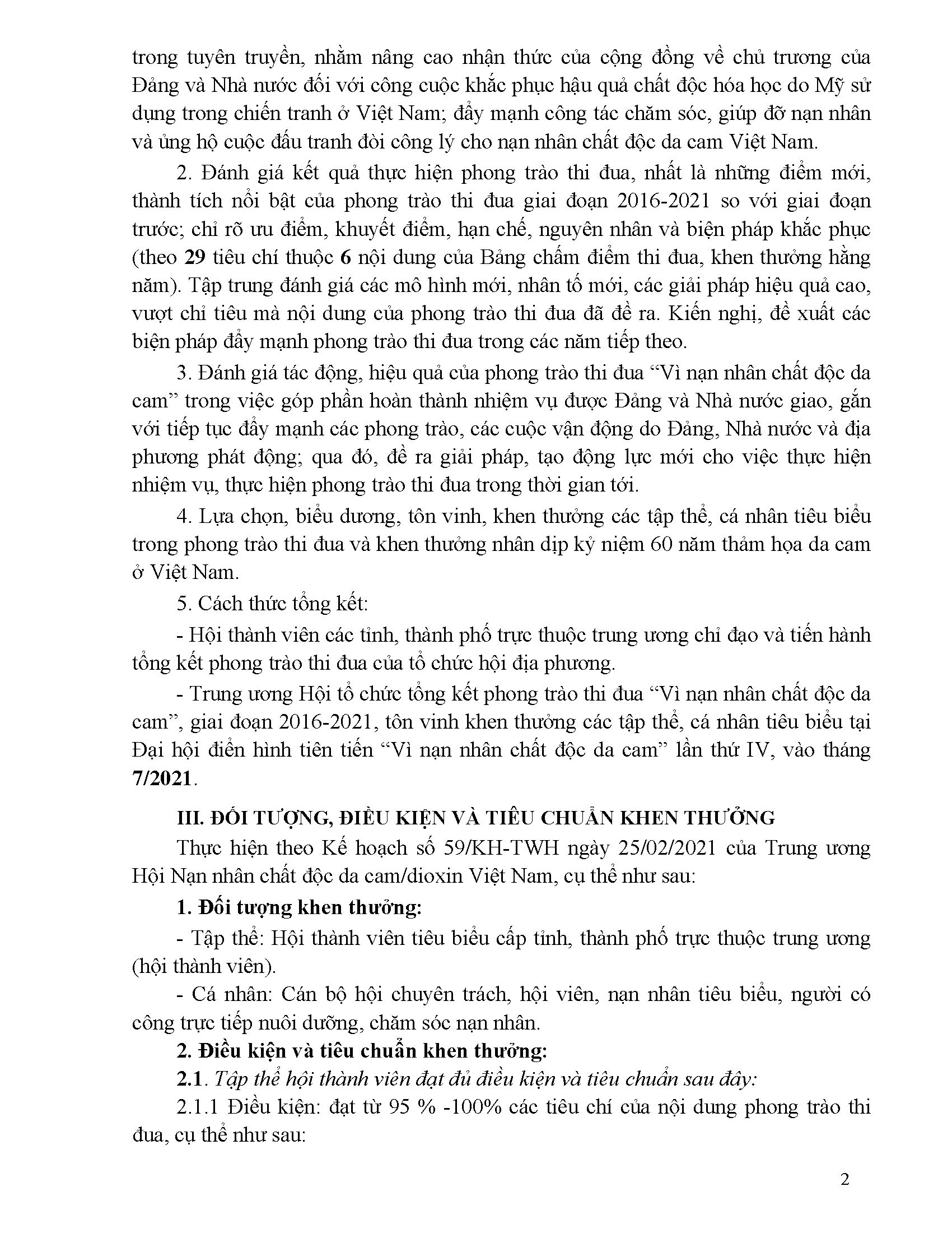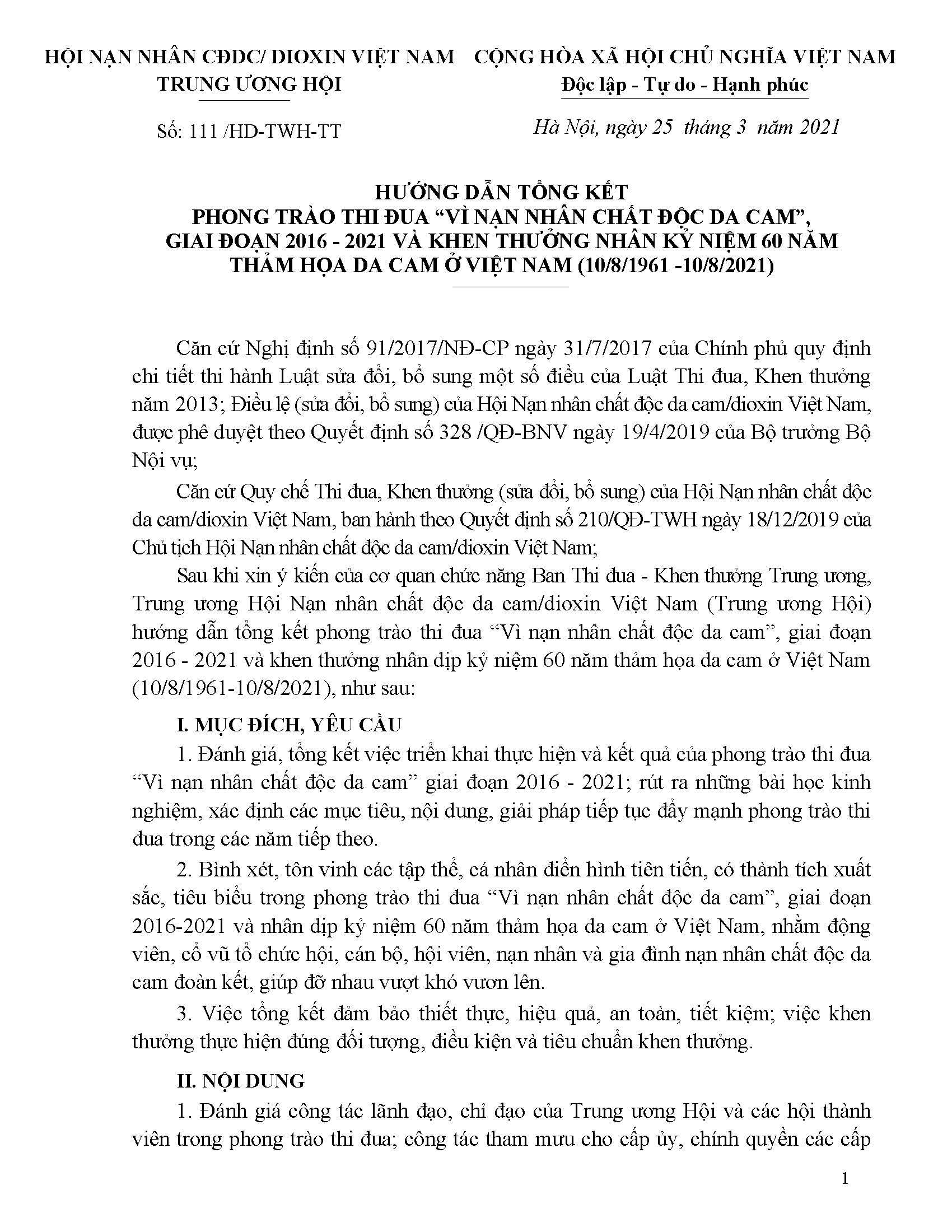 Công văn số 111/HD-TWH-TT Hướng dẫn tổng kết phong trào thi đua “Vì nạn nhân chất độc da cam” giai đoạn 2016 – 2021 và khen thưởng nhân kỷ niệm 60 năm thảm họa da cam ở Việt Nam (10/8/1961-10/8/2021)