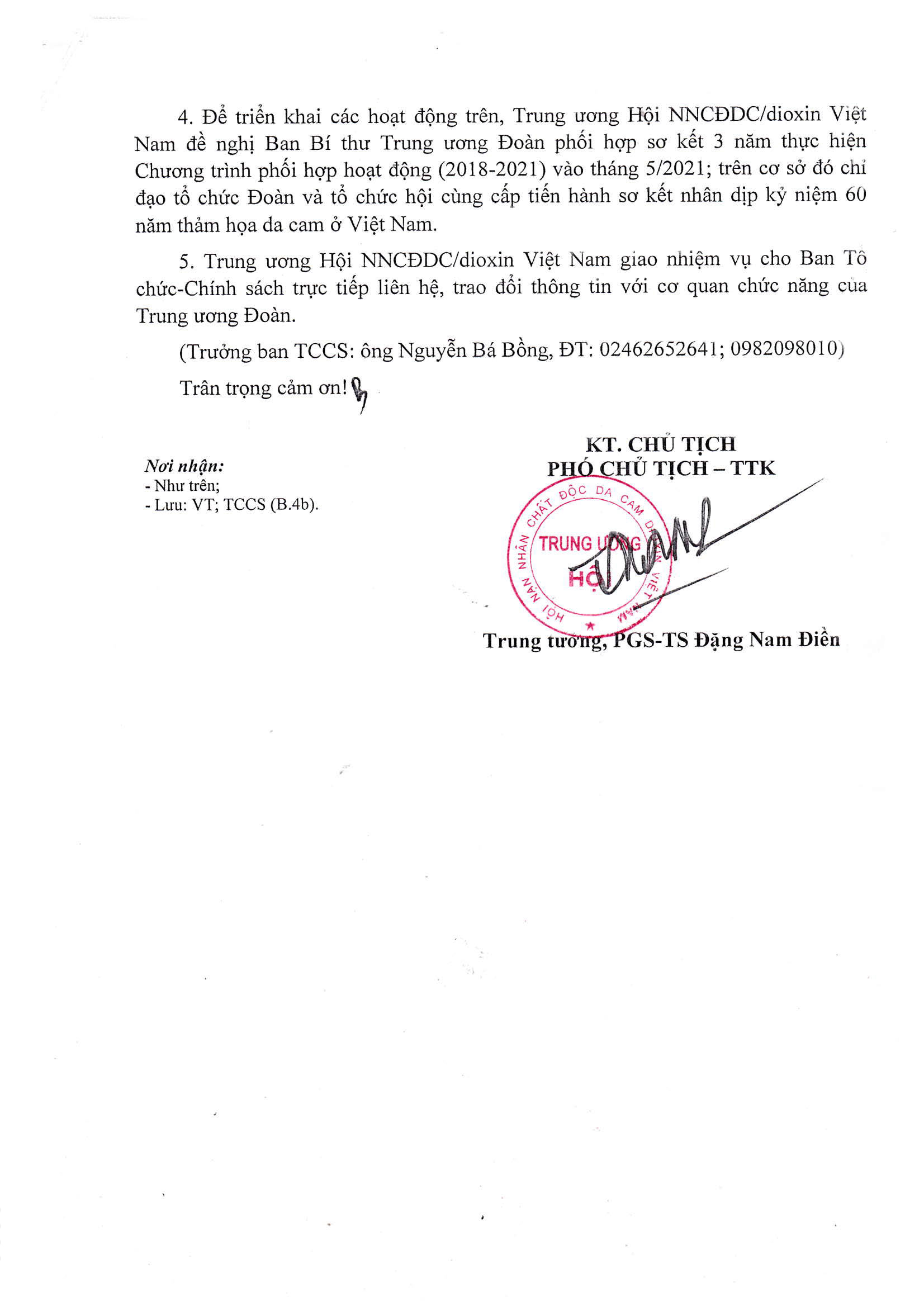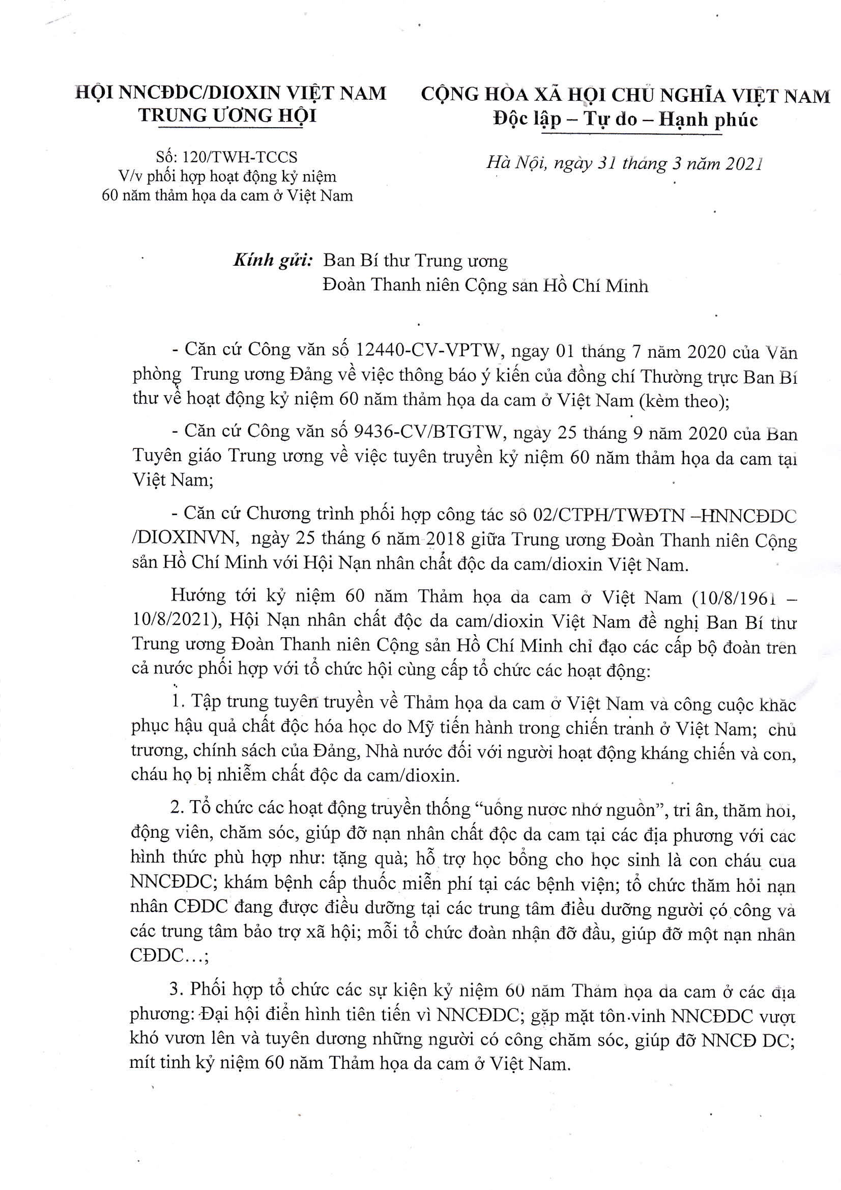 Công văn số 120/TWH-TCCS về việc phối hợp hoạt động kỷ niệm 60 năm thảm họa da cam ở Việt Nam