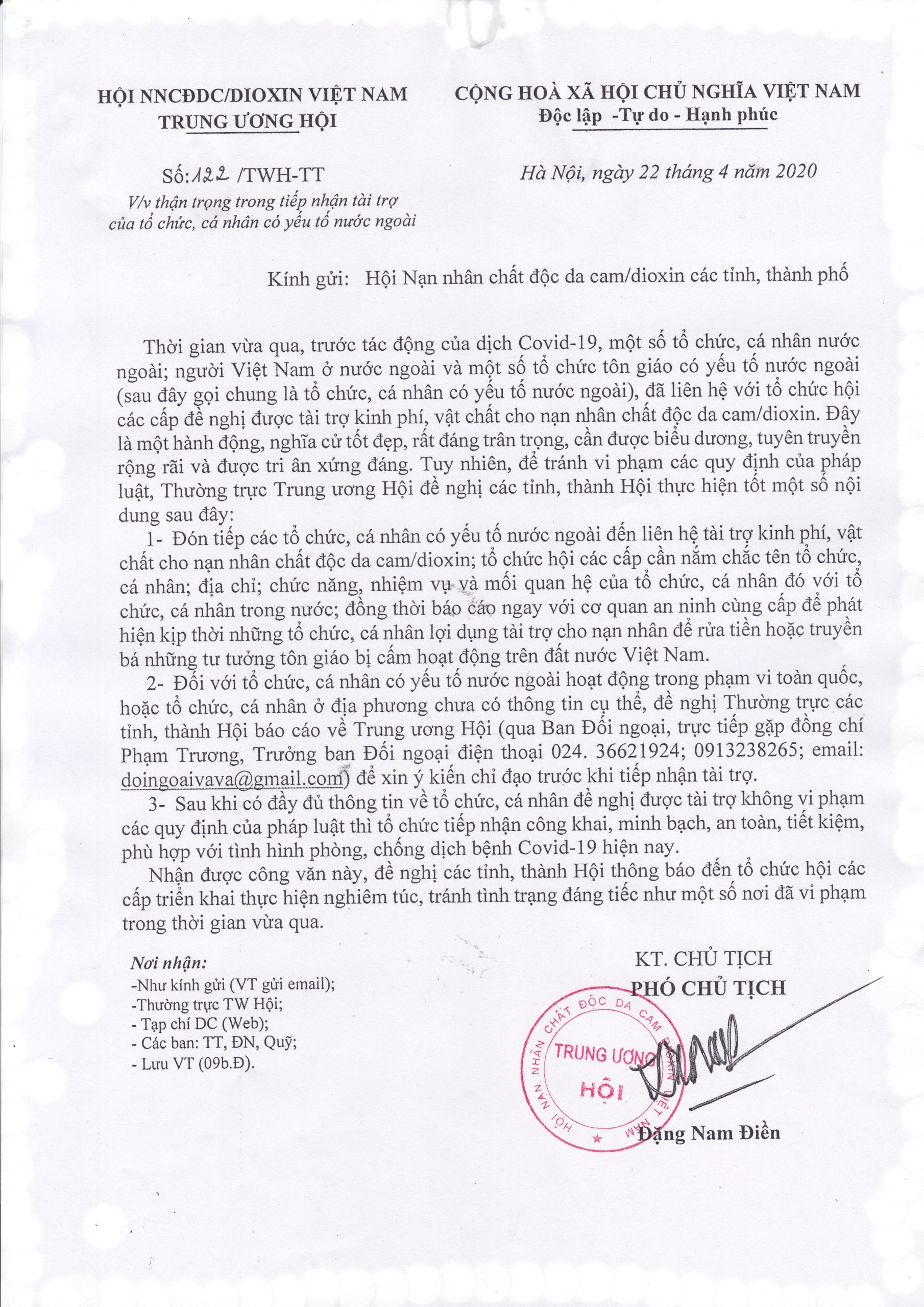 Công văn số: 122/TWH-TT về việc thận trọng trong tiếp nhận tài trợ của tổ chức, cá nhân có yếu tố nước ngoài