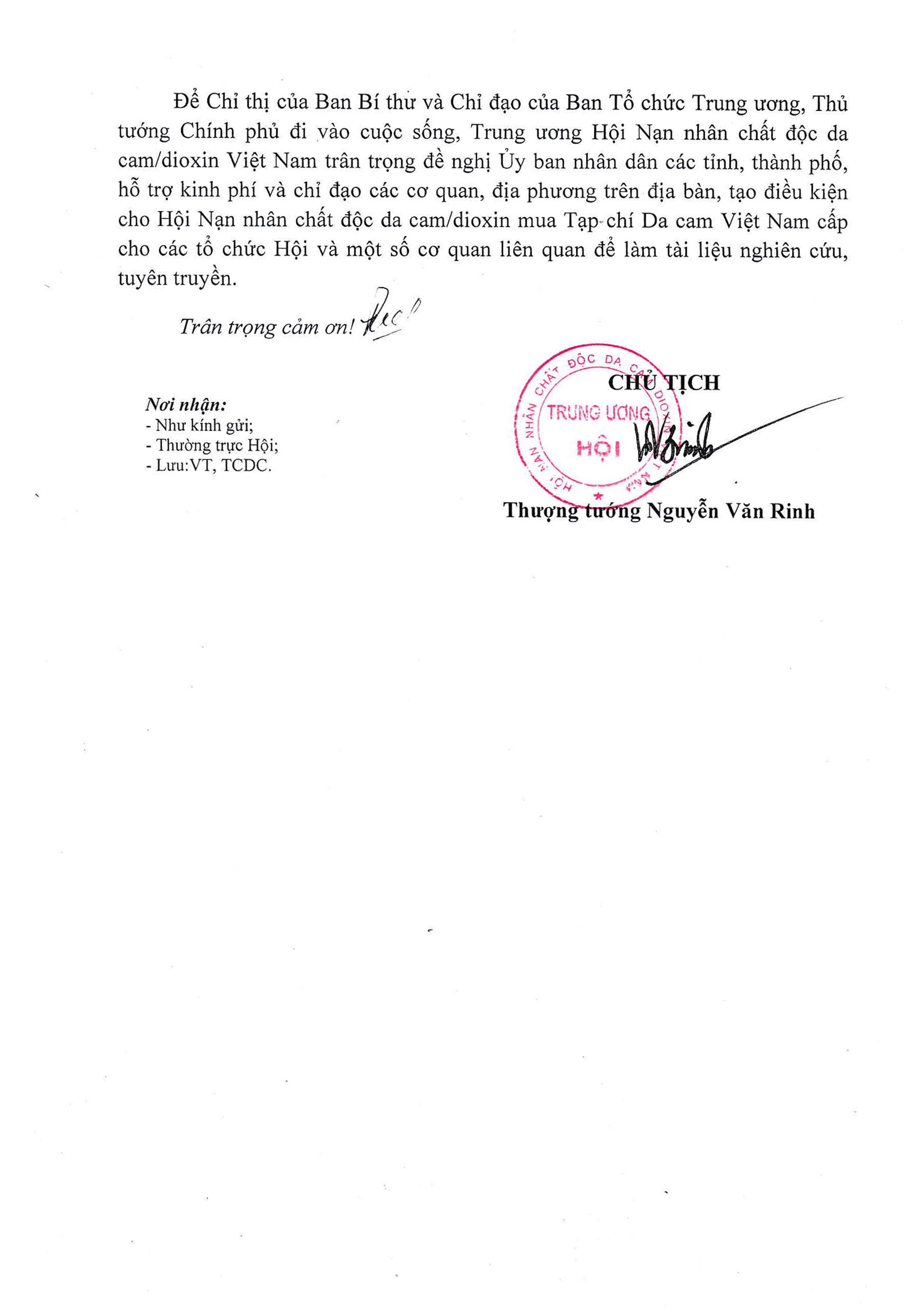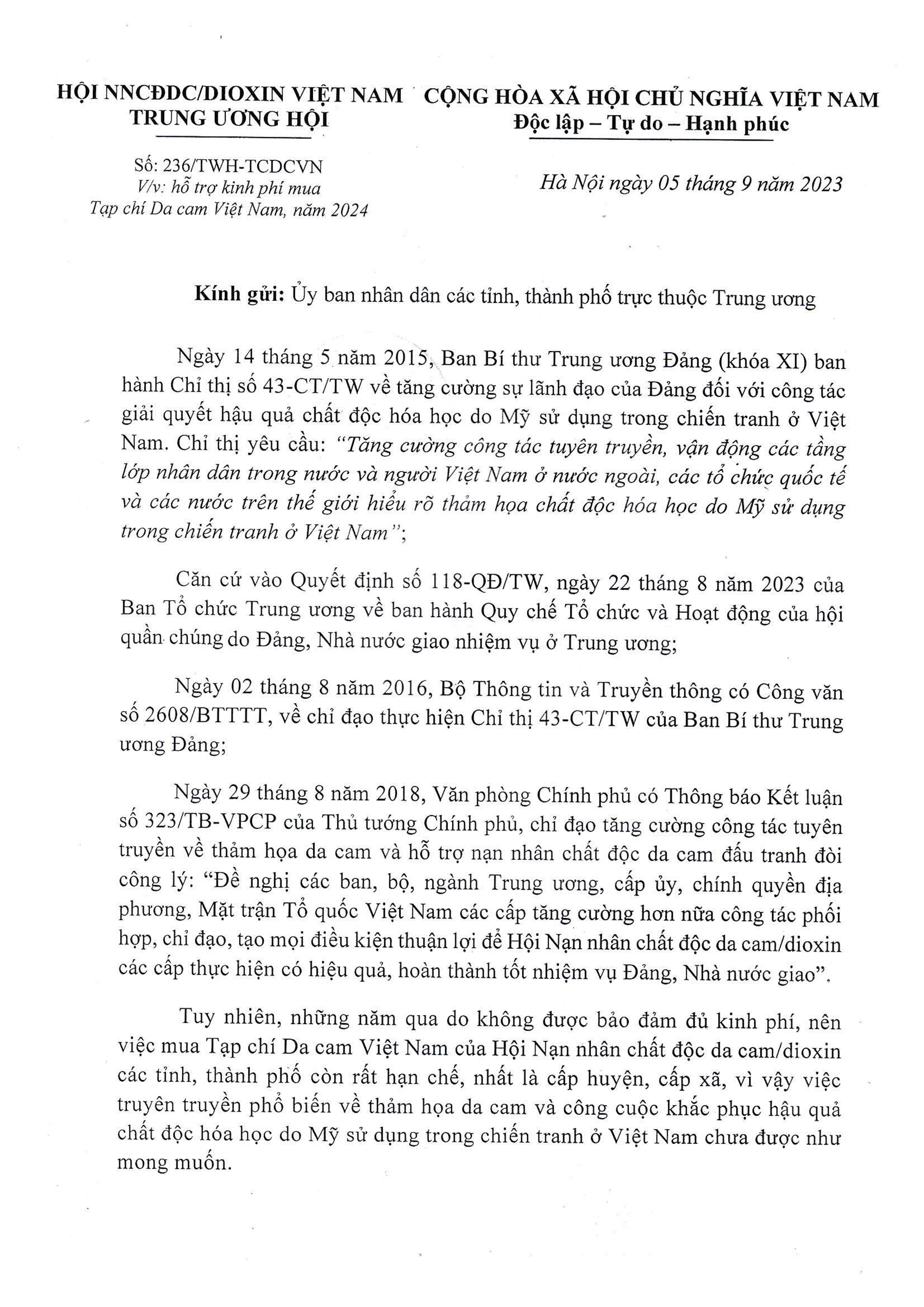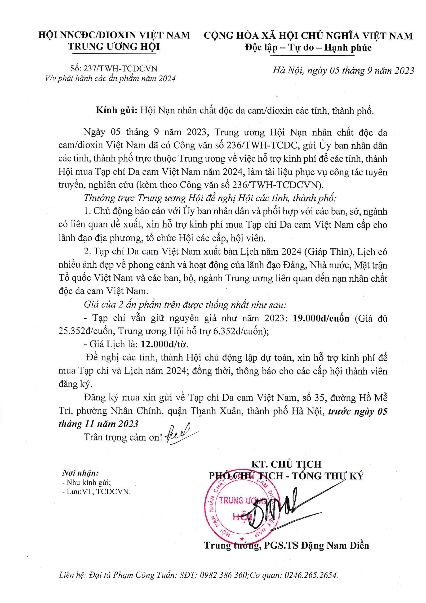 Công văn số 237/TWH-TCDCVN gửi Hội các tỉnh, thành phố về việc phát hành các ấn phẩm năm 2024