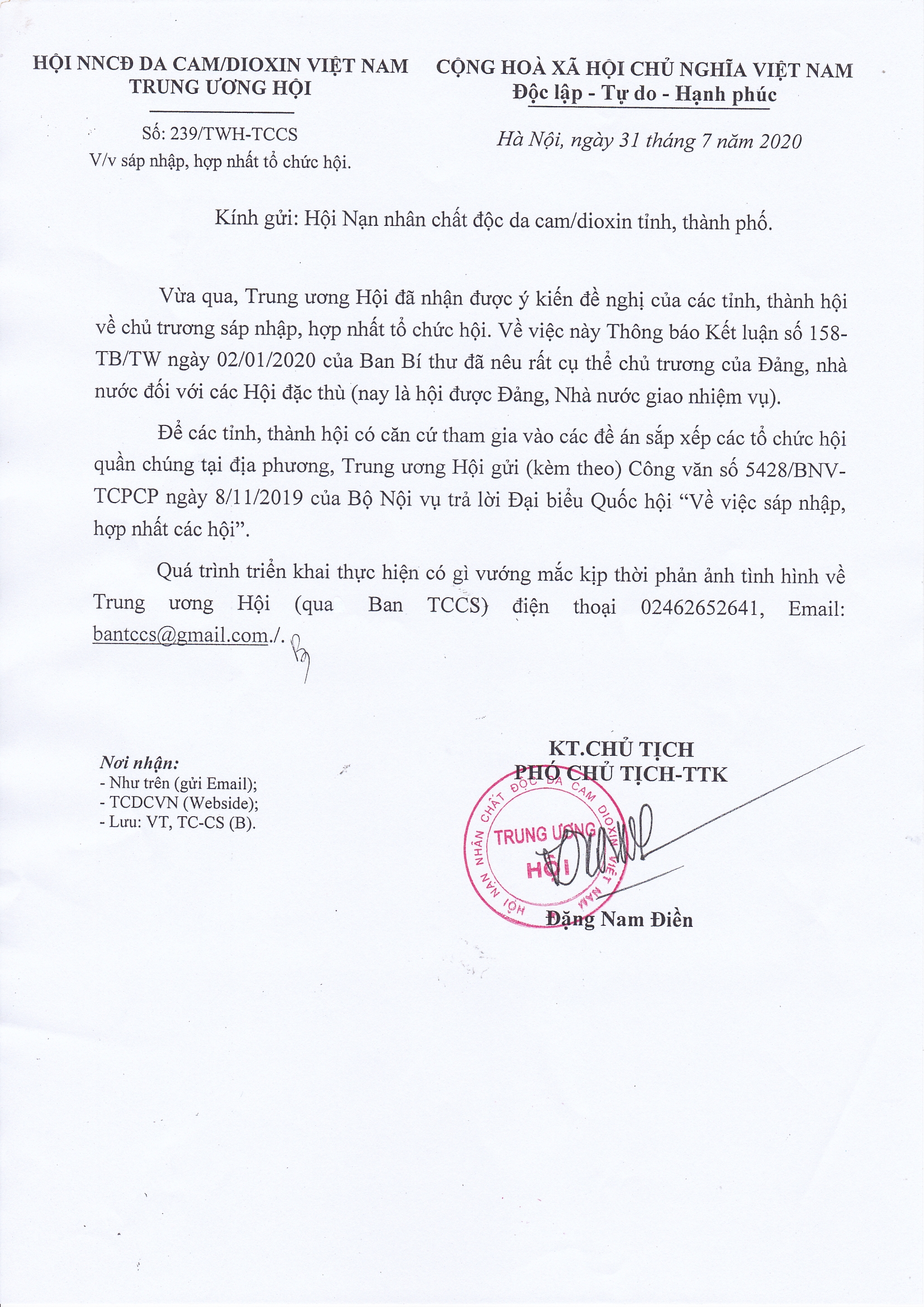Công văn số: 239/TWH – TCCS về việc sáp nhập, tổ chức hội