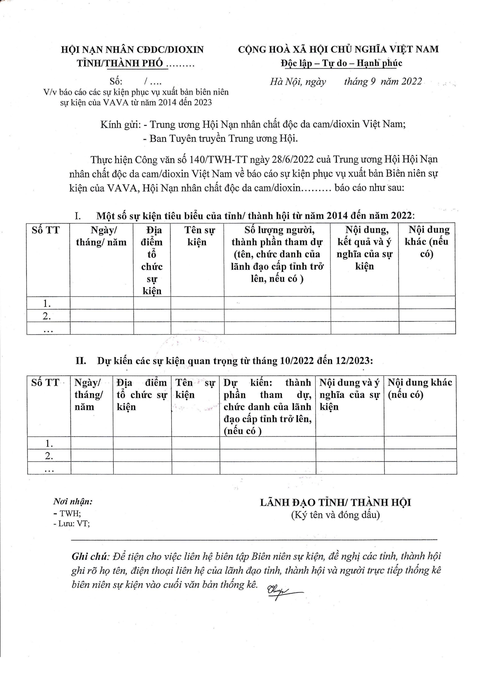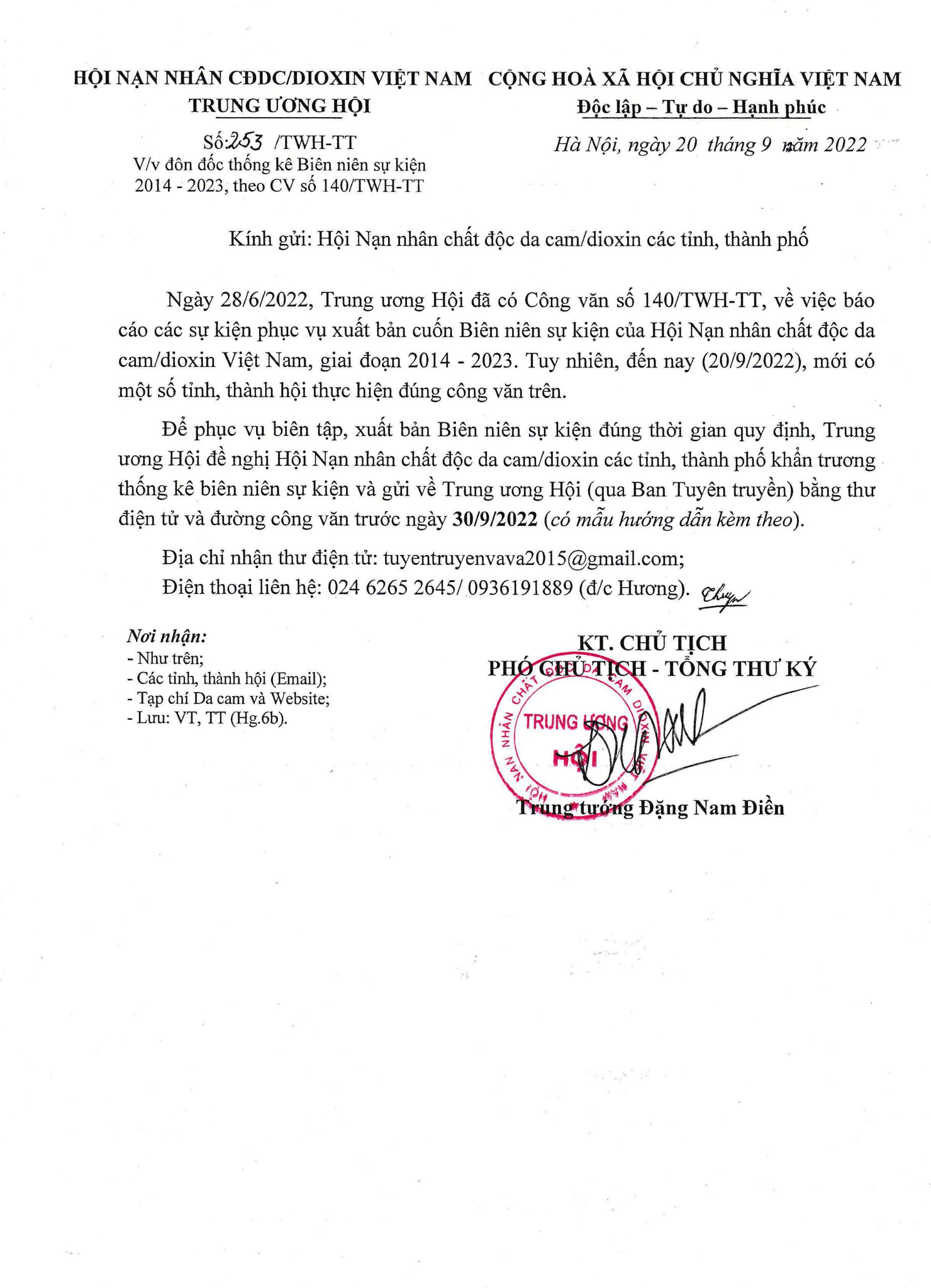 Công văn số 253/TWH-TT về việc Đôn đốc thống kê Biên niên sự kiện 2014-2023, theo công văn số 140/TWH-TT