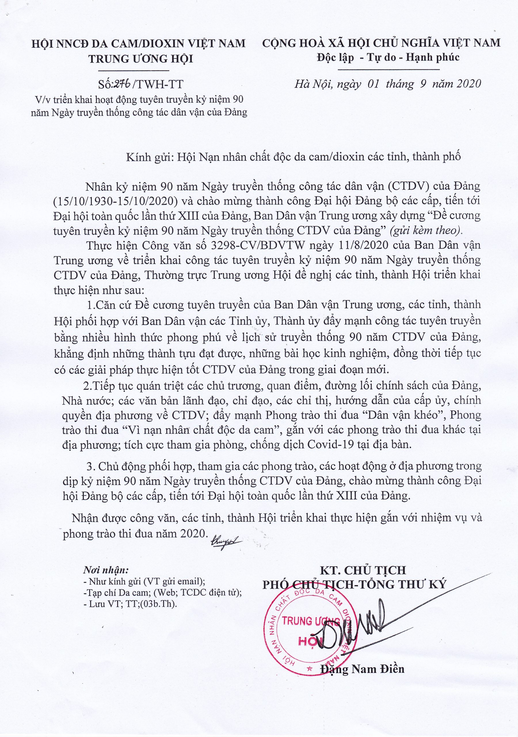 Công văn số: 276/TWH-TT về việc triển khai hoạt động tuyên truyền kỷ niệm 90 năm ngày truyền thống công tác dân vận của Đảng