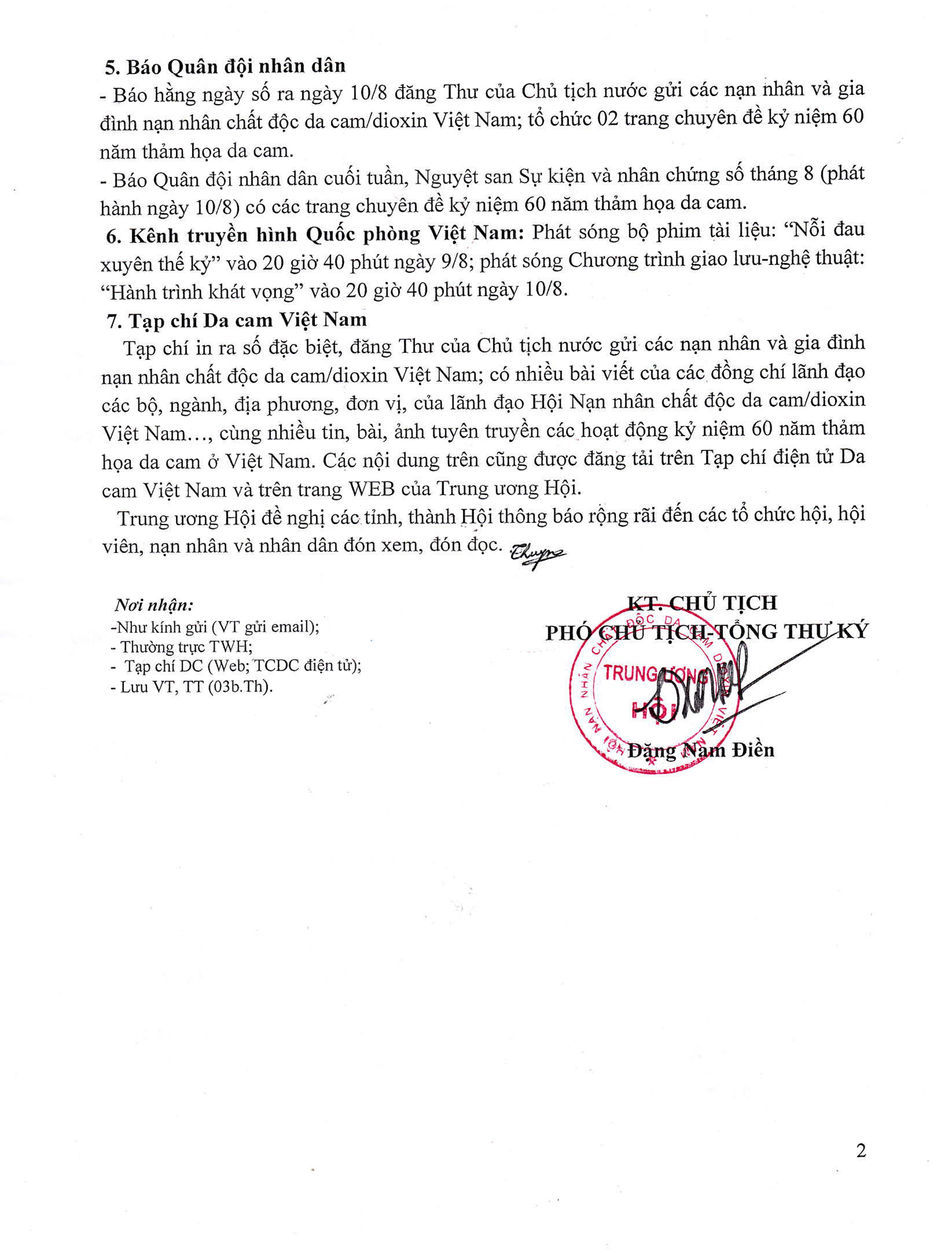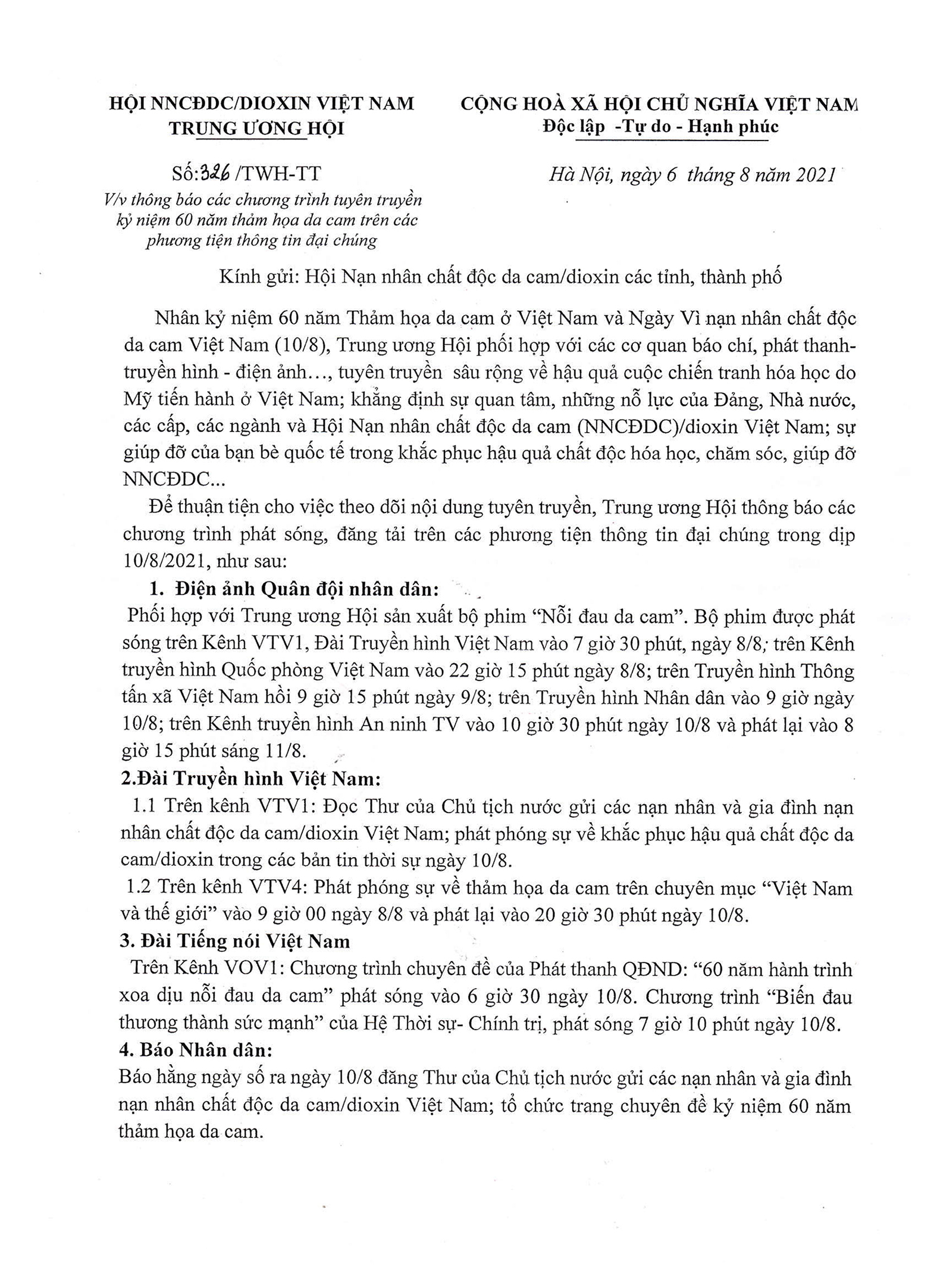 Công văn số 326/TWH-TT về việc thông báo các chương trình tuyên truyền kỷ niệm 60 năm thảm họa da cam trên các phương tiện thông tin đại chúng