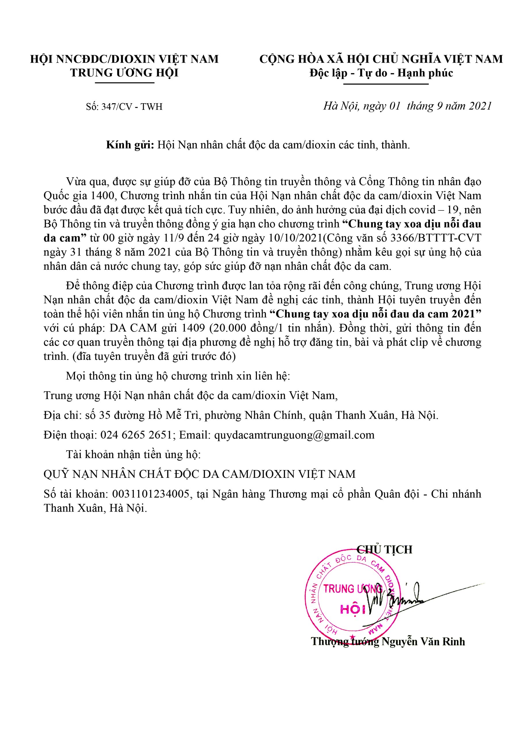 Công văn số 347/CV-TWH về việc gia hạn Chương trình nhắn tin “Chung tay xoa dịu nỗi đau da cam 2021”