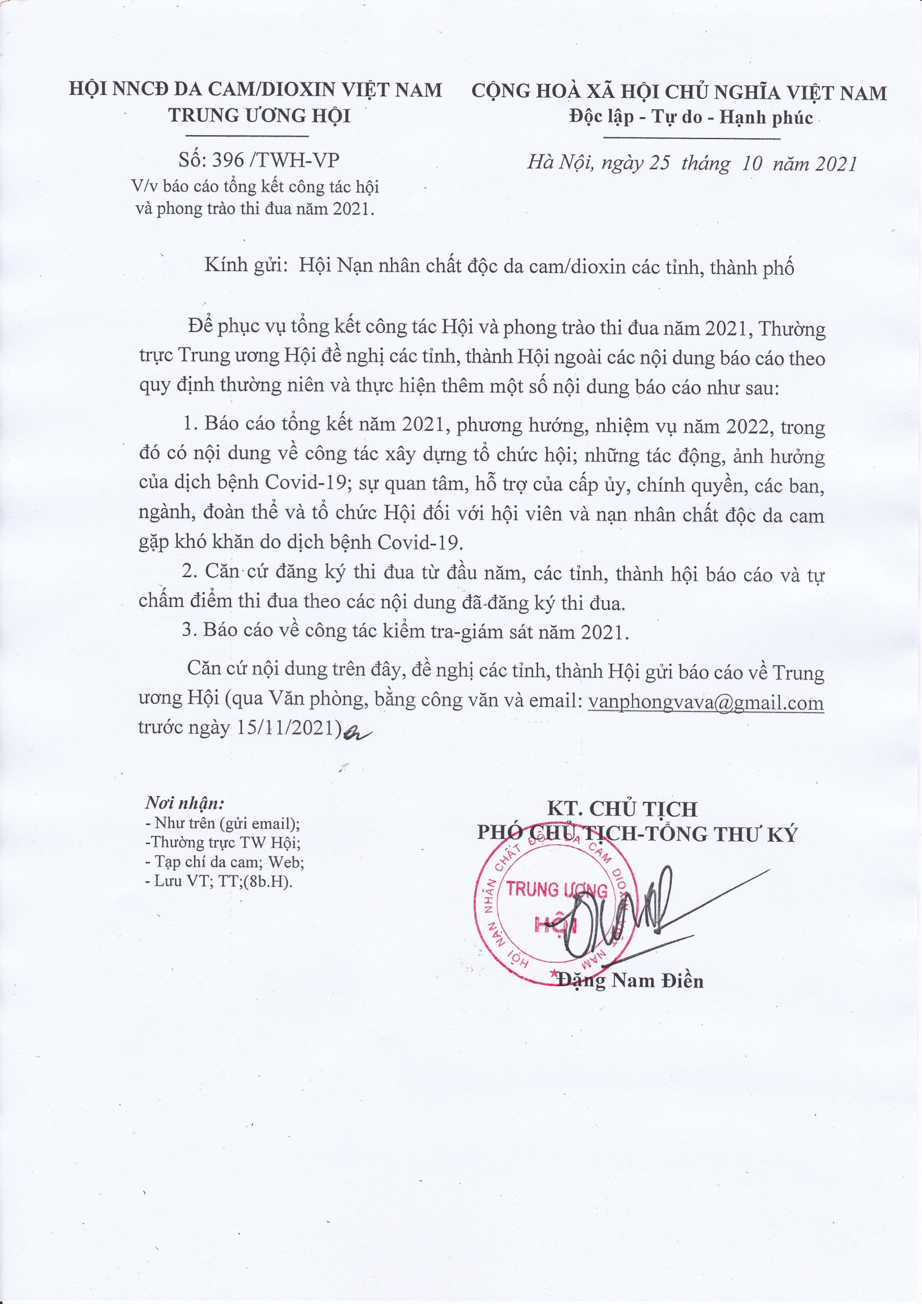 Công văn số 396/TWH-VP về việc báo cáo tổng kết công tác Hội và phong trào thi đua năm 2021