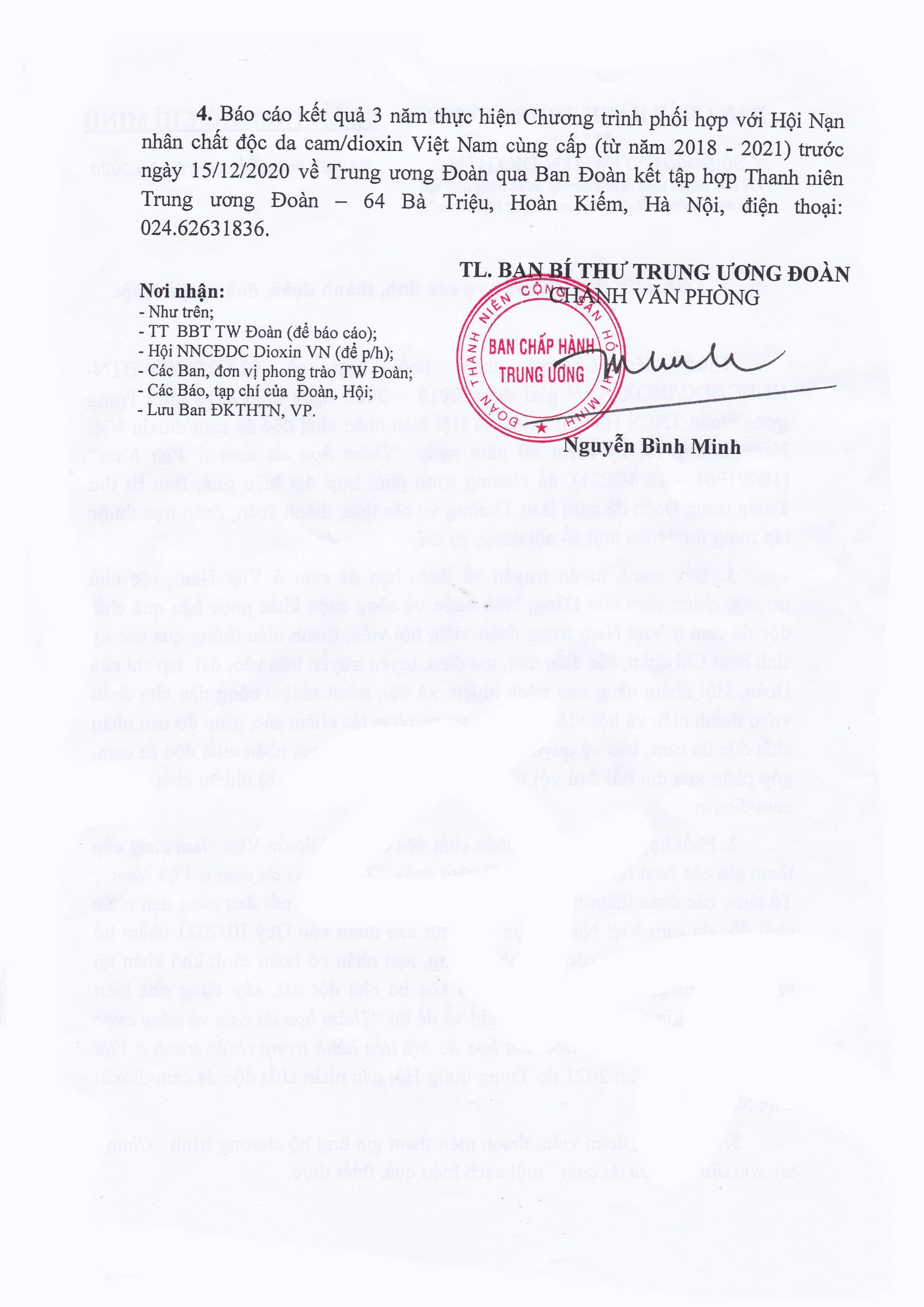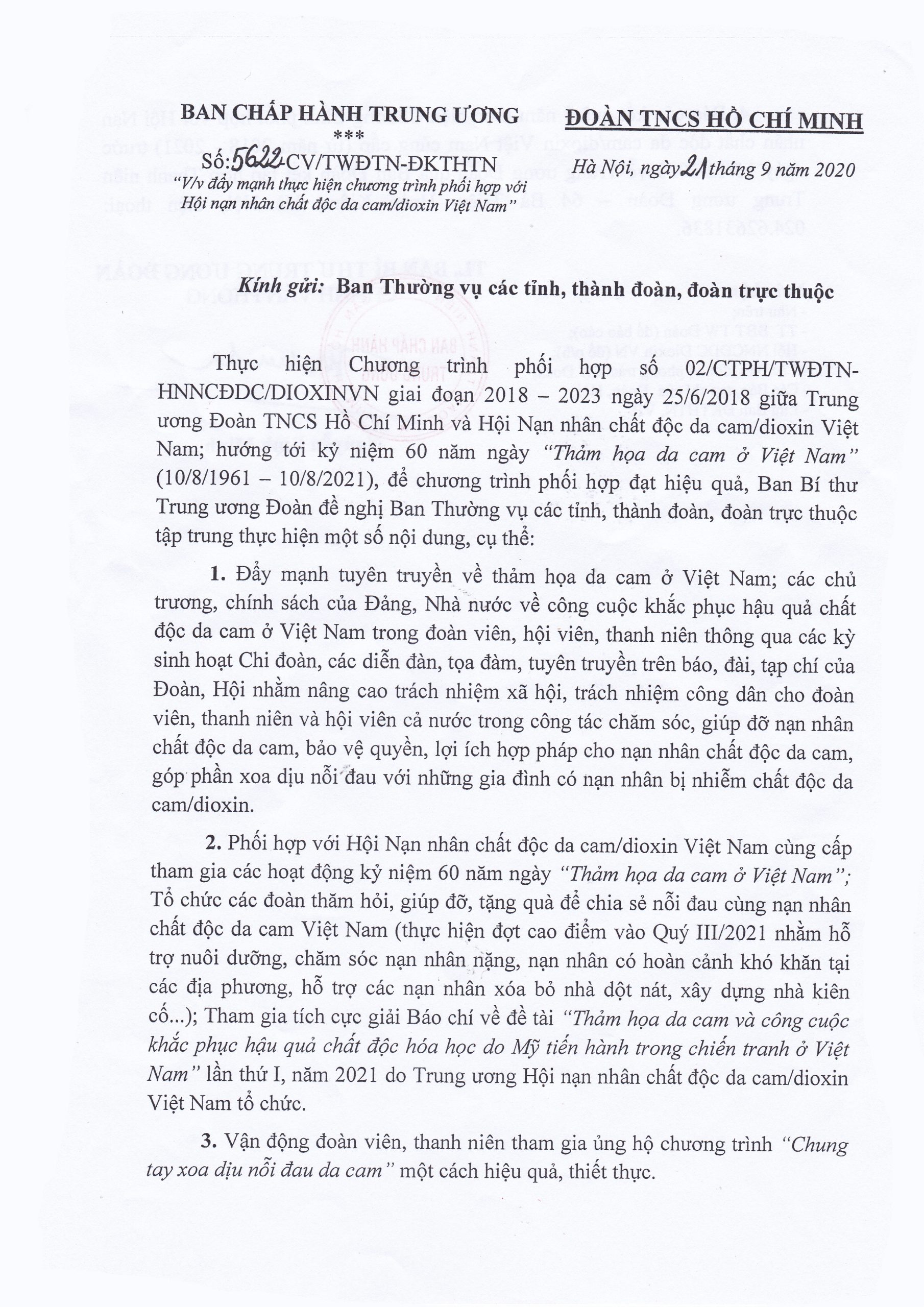 Công văn số: 5622-CV/TWĐTN-ĐKTHTN của Ban Chấp hành TW Đoàn TNCS Hồ Chí Minh về việc đẩy mạnh thực hiện chương trình phối hợp với Hội Nạn nhân chất độc da cam/dioxin Việt Nam