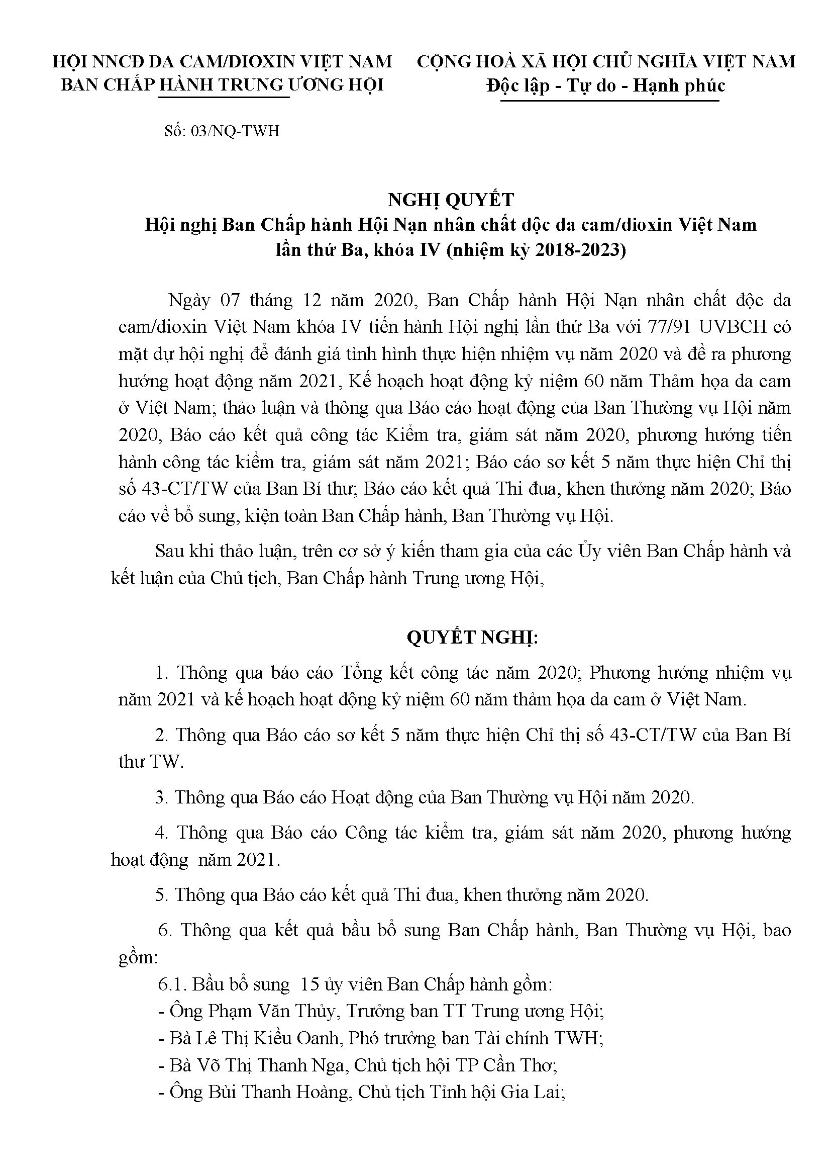 Nghị quyết Hội nghị Ban Chấp hành Hội Nạn nhân chất độc da cam/dioxin Việt Nam lần thứ Ba, khóa IV (nhiệm kỳ 2018-2023)