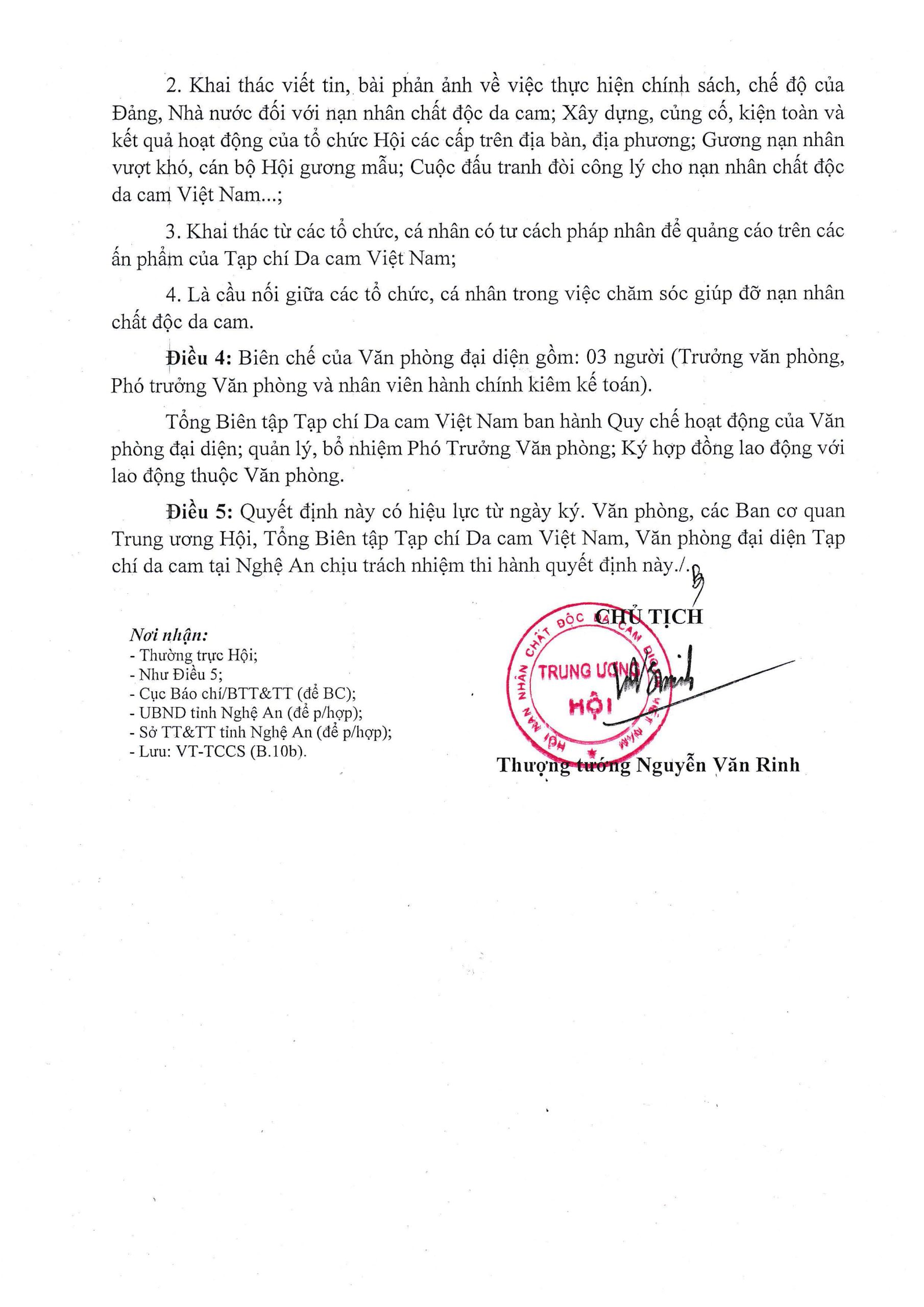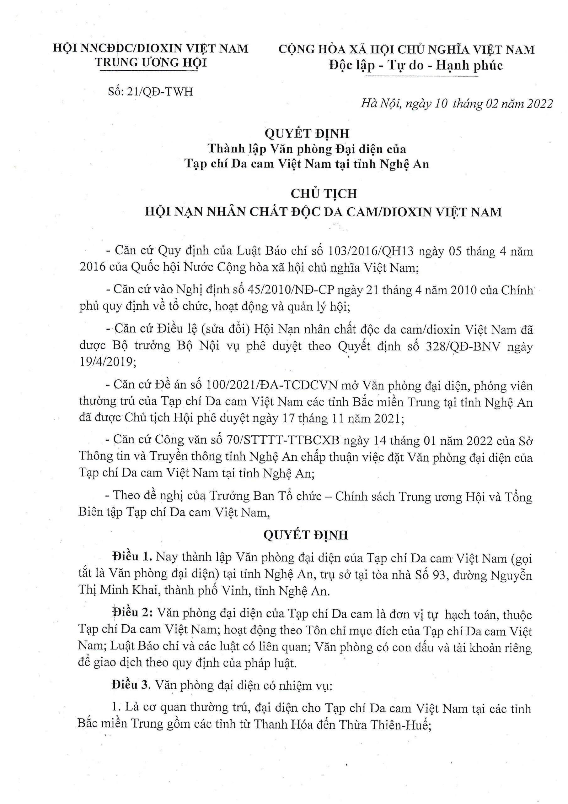 Quyết định thành lập Văn phòng đại diện của Tạp chí Da cam Việt Nam khu vực Bắc miền Trung tại tỉnh Nghệ An