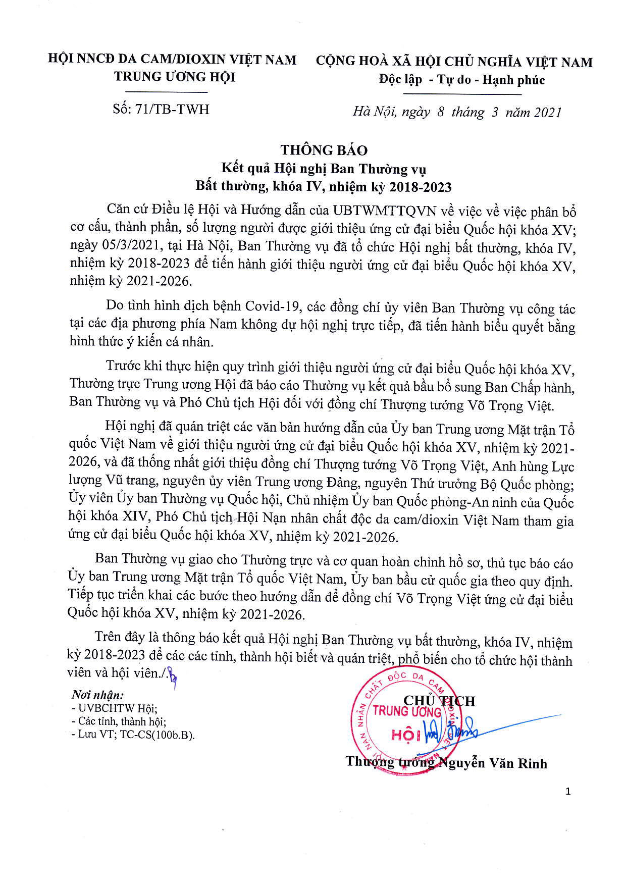 Thông báo Kết quả Hội nghị Ban Thường vụ bất thường, khóa IV, nhiệm kỳ 2018-2023