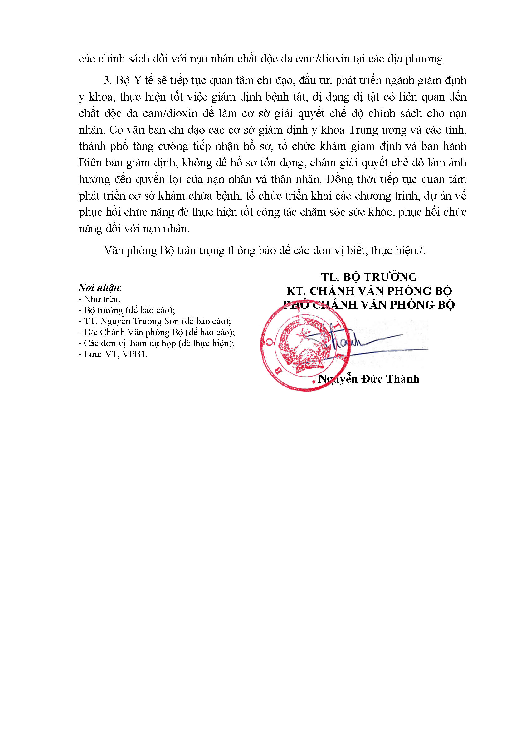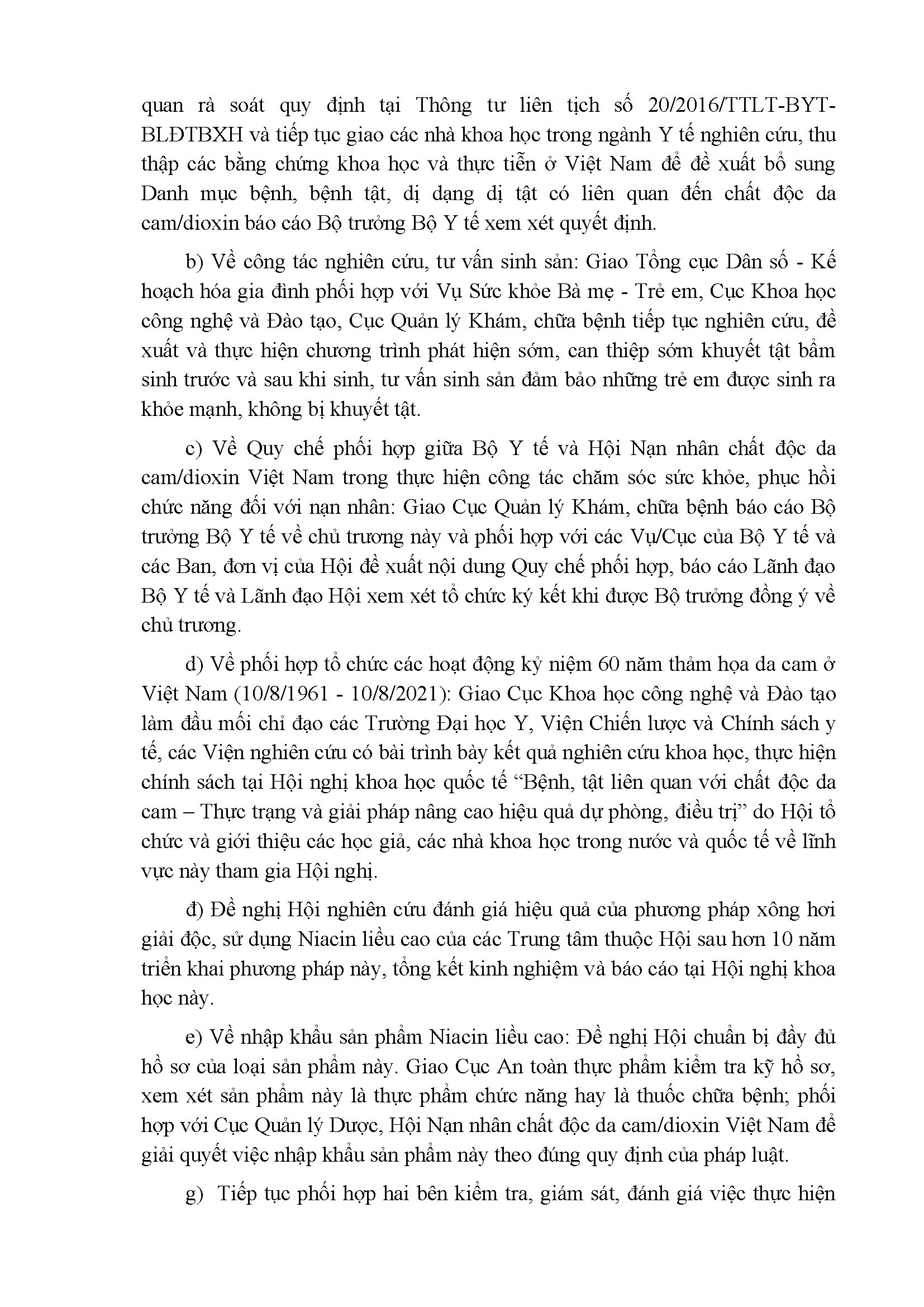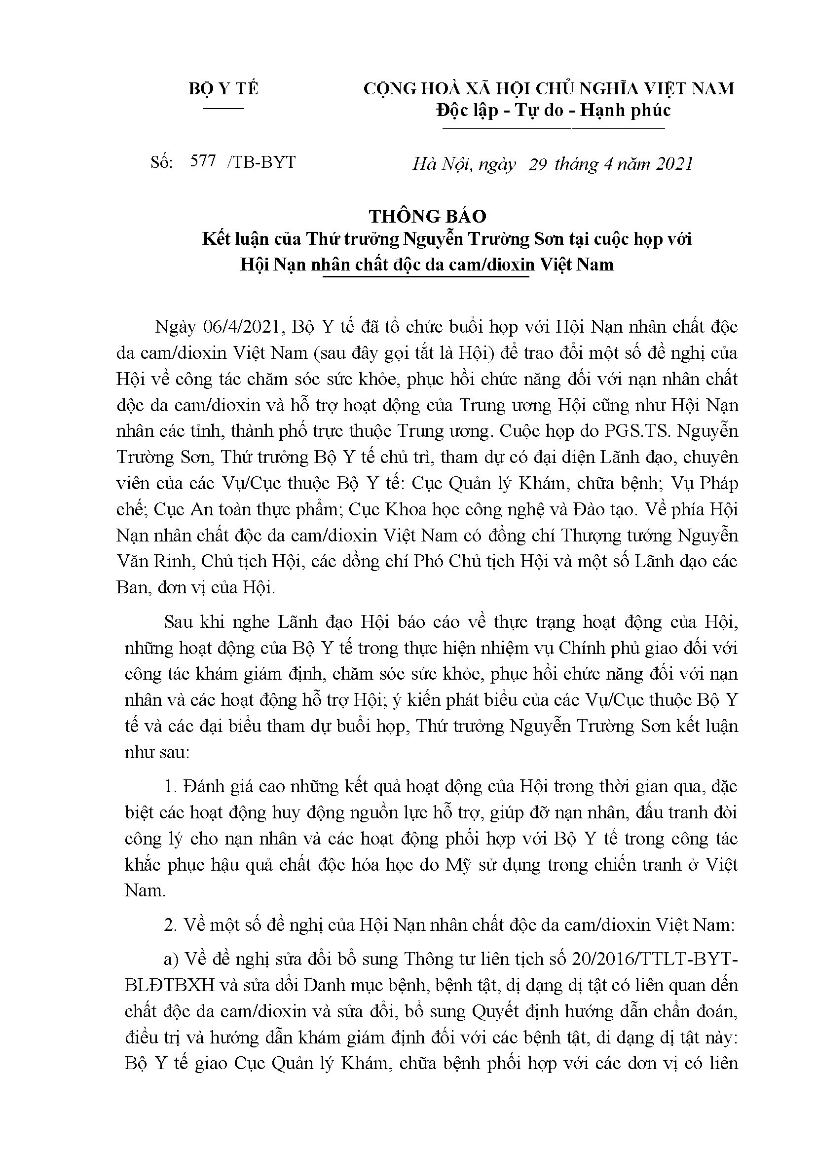 Thông báo số: 577/TB-BYT Kết luận của Thứ trưởng Nguyễn Trường Sơn tại cuộc họp với Hội Nạn nhân chất độc da cam/dioxin Việt Nam
