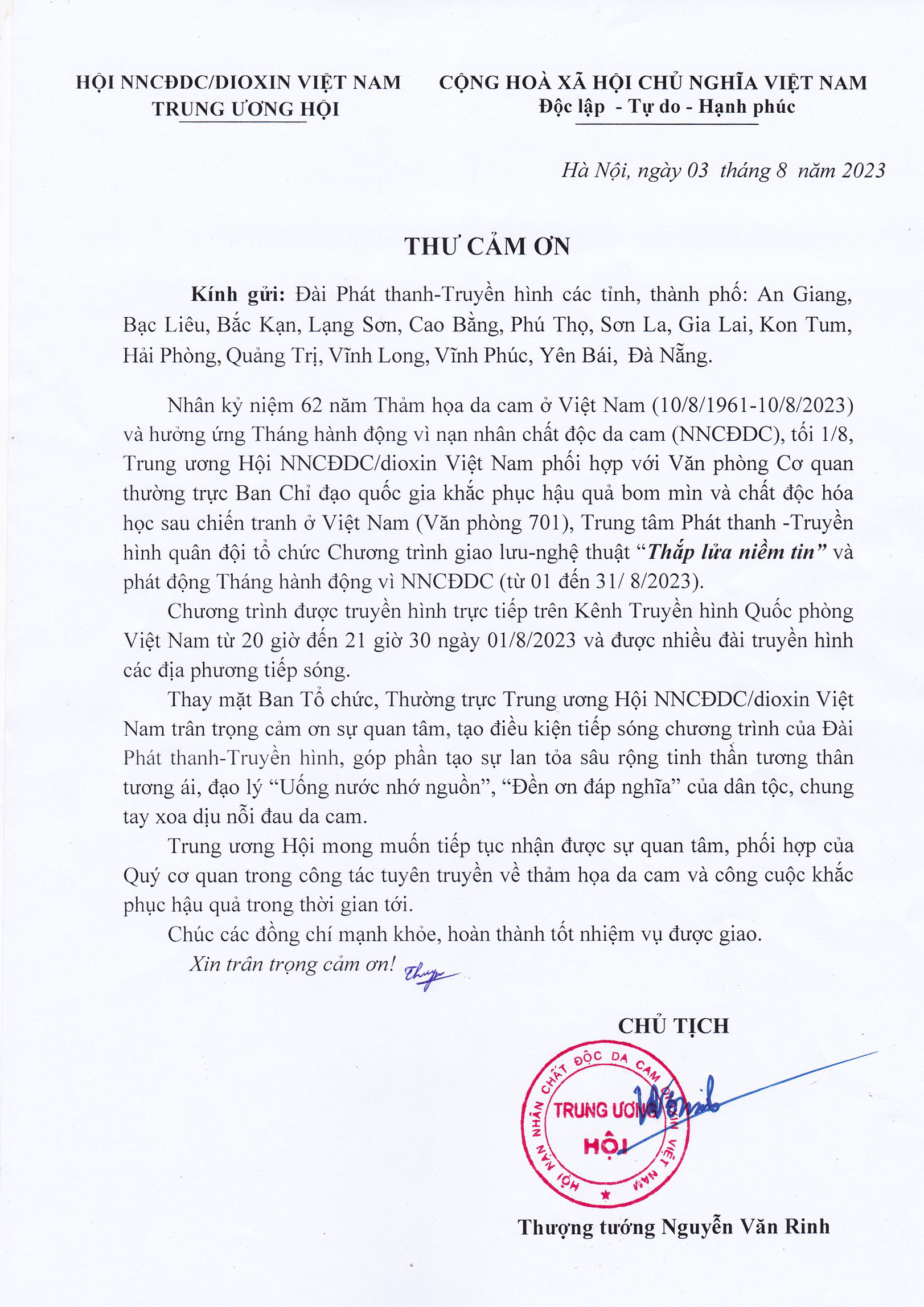 Thư cảm ơn Đài Phát thanh – truyền hình các tỉnh, thành phố trên cả nước tiếp sóng Chương trình giao lưu – nghệ thuật “Thắp lửa niềm tin”