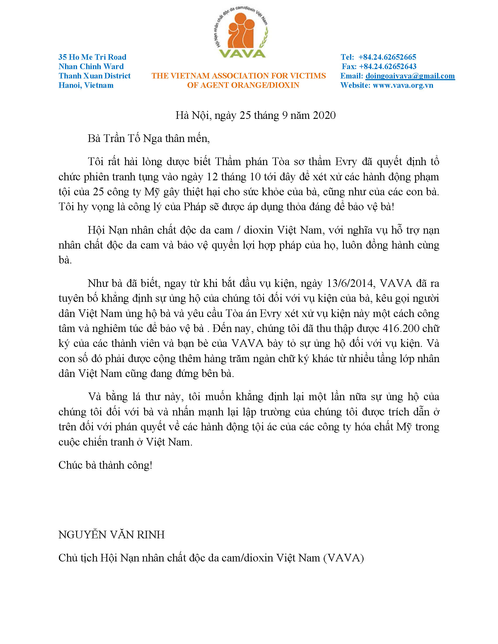 As you know, right from the beginning of the lawsuit, on June 13, 2014, VA VA issued a statement affirming our support for your case, calling on the Vietnamese people to support you and asking the Court of Evry to hear this case fairly and seriously for your protection. To date, we have collected 416,200 signatures of VAVA members and friends expressing their support for your lawsuit. And there are also hundreds of thousands of other signatures of Vietnamese people from many social strata, who are also accompanying you.