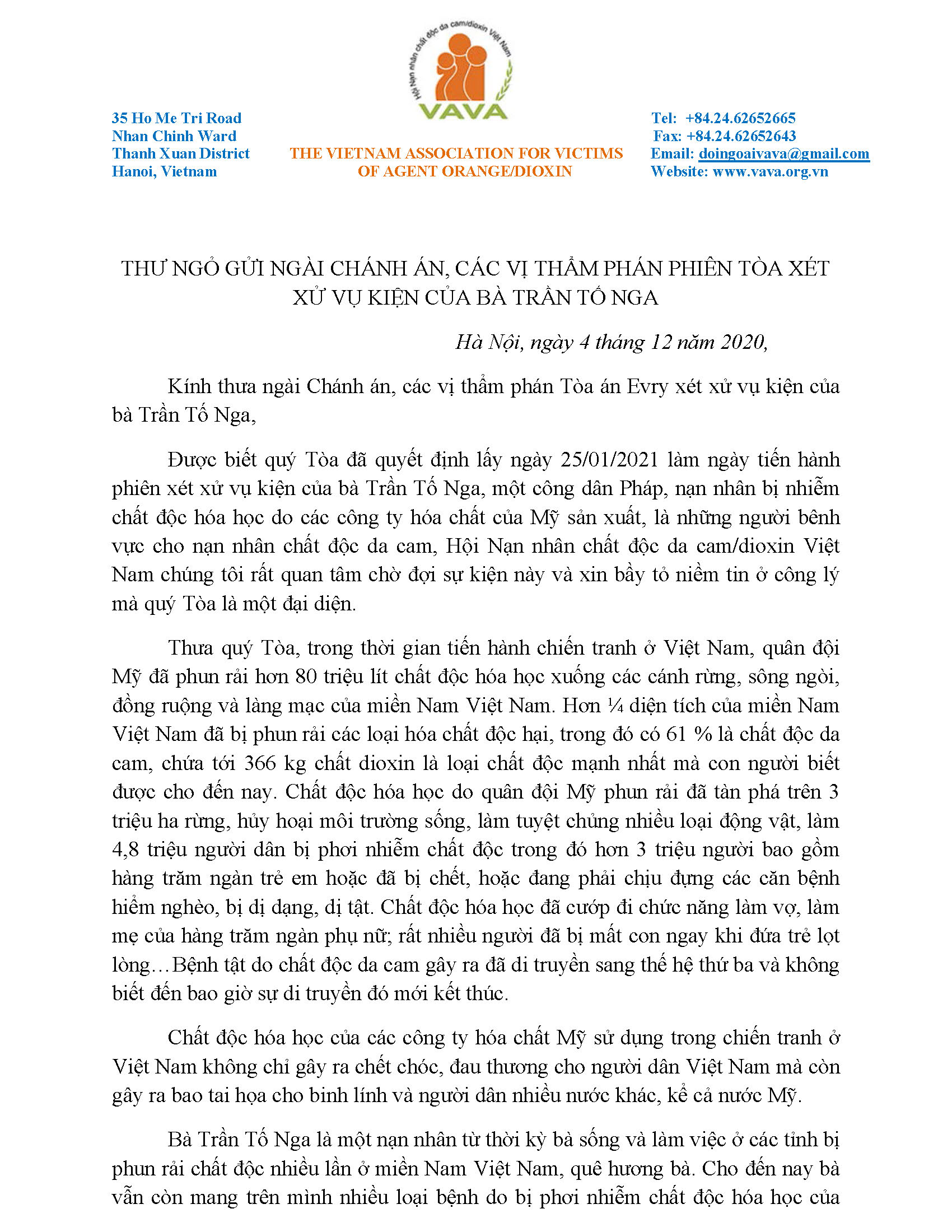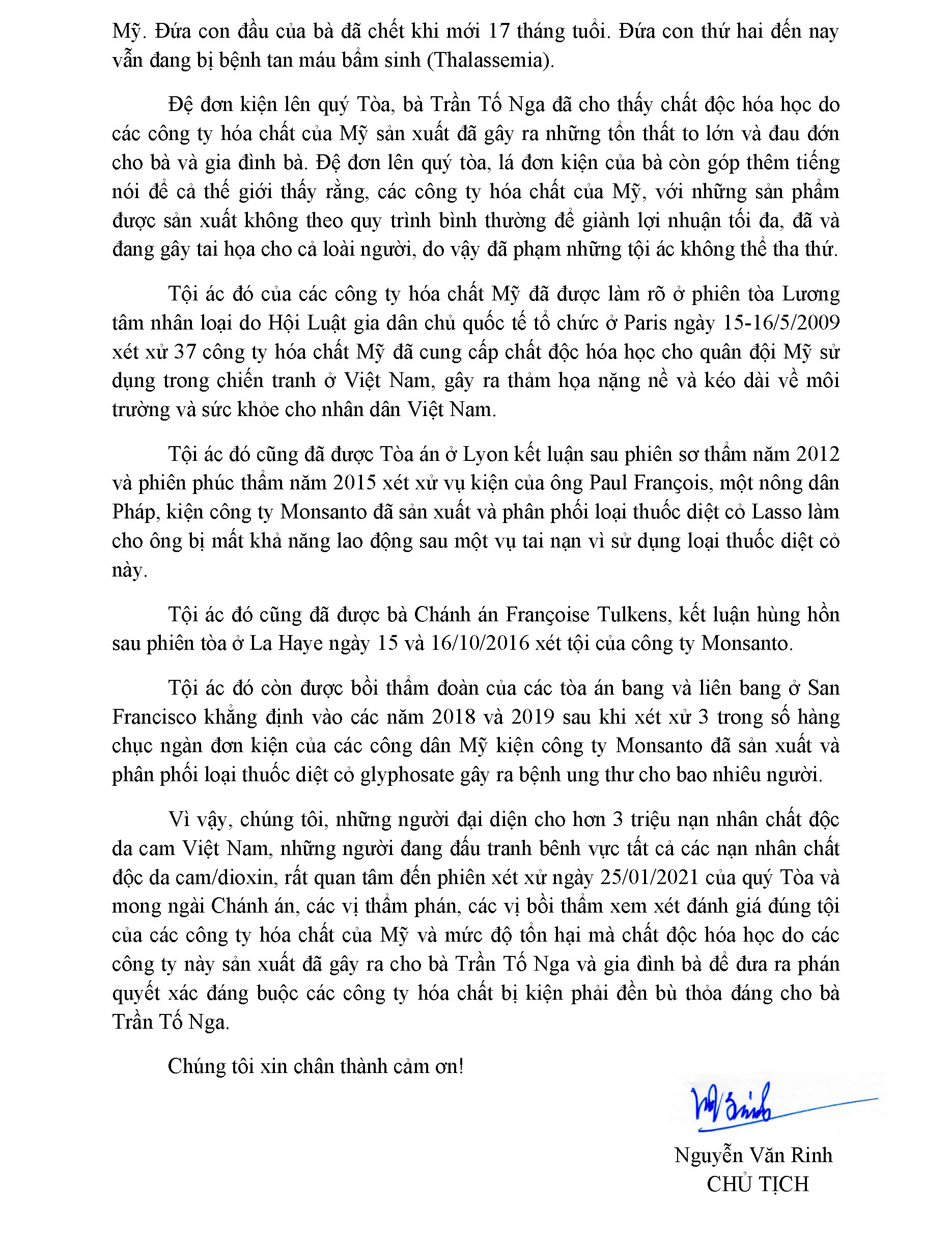 Thư của Chủ tịch Nguyễn Văn Rinh gửi Chánh án và các thẩm phán Tòa án Evry xét xử vụ kiện của bà Trần Tố Nga